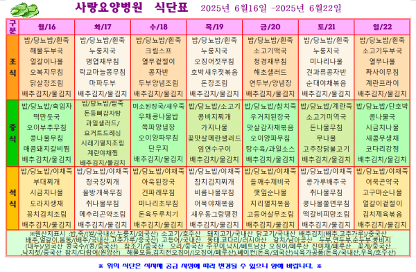 사랑요양병원 6월 둘째주 식단표