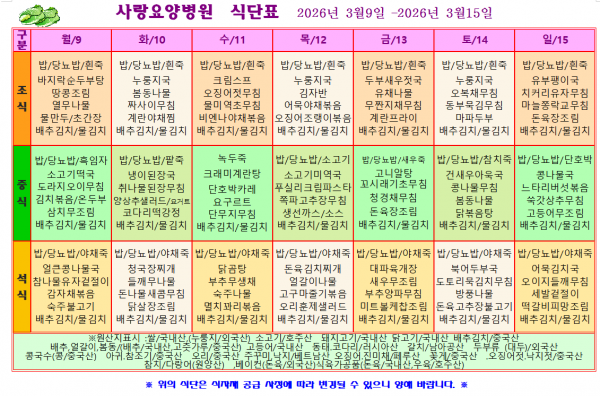 사랑요양병원 3월 둘째주 식단표