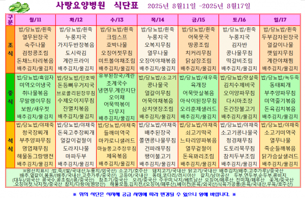 사랑요양병원 8월 셋째주 식단표