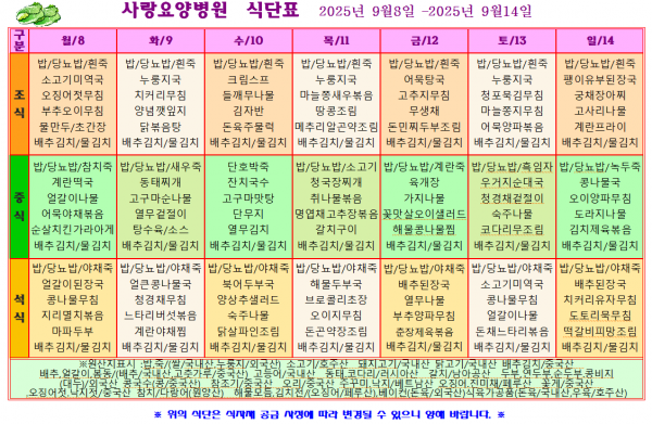 사랑요양병원 9월 둘째주 식단표