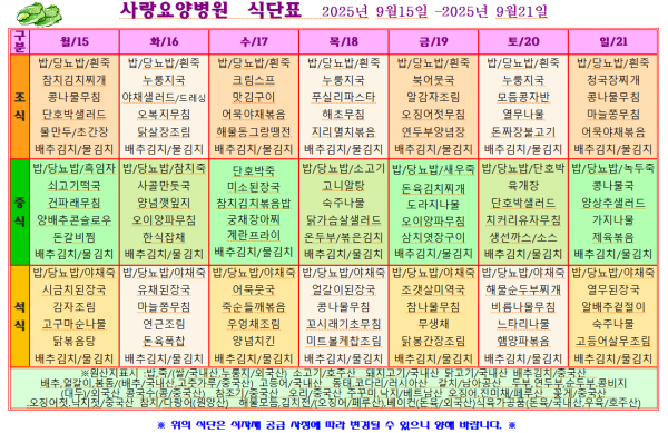 사랑요양병원 9월 셋째주 식단표